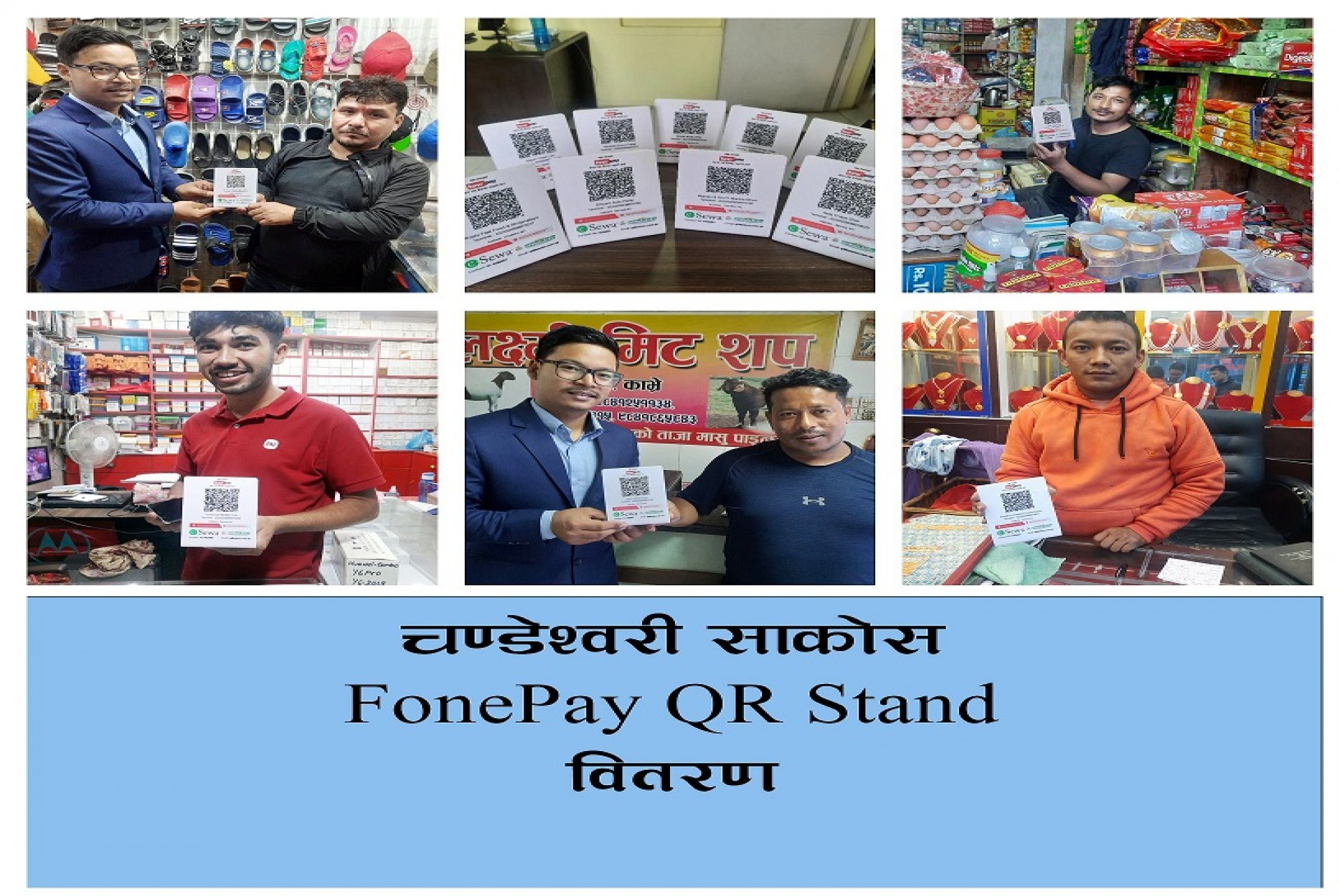 बनेपायस साकोसले आफ्नो सदस्यहरुलाई सर्वसुलभ रुपमा डिजिटल बैकिङ्ग सेवा प्रदान गर्ने उद्देश्यका साथ FonePay QR Stand सेवाको शुभारम्भ गरेको छ । व्यवसायी कर्ताहरुको दैनिक व्यापार व्यवसाय Cashless गर्न तथा सर्वसुलभ तरिकाले सामानको भुक्तान प्राप्त गर्नका लागि चण्डेश्वरी साकोसले आफ्ना व्यवसायी सदस्यहरुलाई FonePay QR Stand वितरण गरेको हो ।