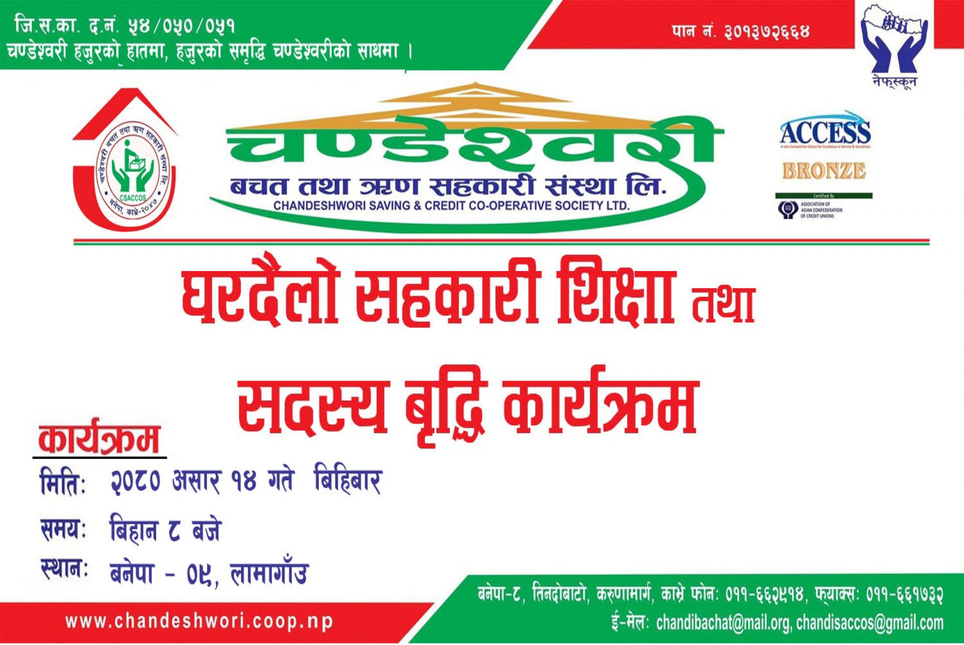 बनेपा 9 Lama Gaunमिति २०८० असार १४ गते बिहिबारको दिन यस चण्डेश्वरी बचत तथा ऋण सहकारी संस्था लि। बनेपा को समुह बचत उप समितिको संयोजकत्वमा घरदैलो सहकारी शिक्षा तथा सदस्य बृद्धि कार्यक्रम सम्पन्न भयको छ । कार्यक्रममा बनेपा ०९, लामा गाँउ क्षेत्रका सदस्य तथा संभावित सदस्यहरूसंग भेटघाट गरी संस्थाबाट प्रदान गरिने सेवासुविधाहरु सम्बन्धी, सदस्यहरुको गुनासो तथा सुझाव आदी विषयहरूमा छलफल गरिएको थियो । कार्यक्रम मार्फत २८ जना शेयर सदस्य र ६ जना बाल सदस्य गरि ३४ जना नयाँ सदस्य संस्थामा आबद्ध हुनु भएको थियो ।