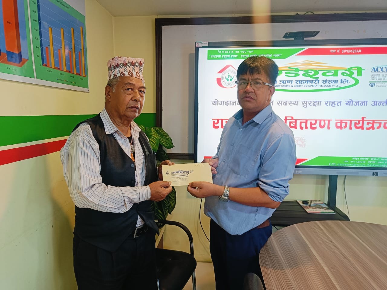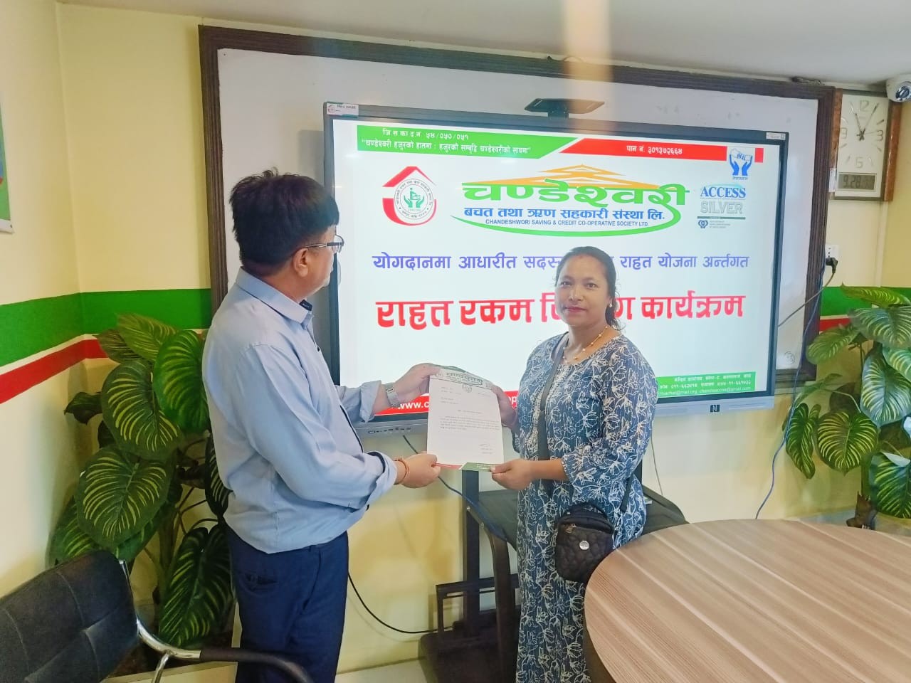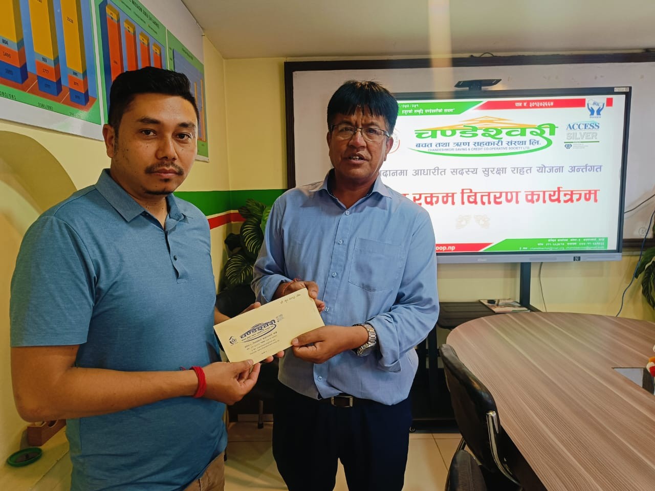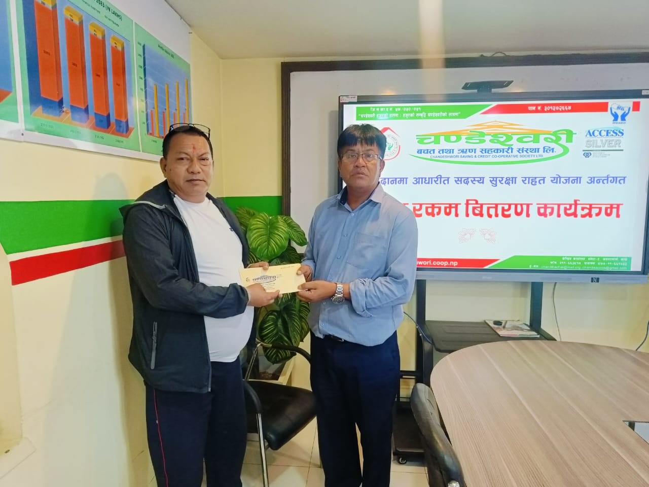 बनेपायस चण्डेश्वरी बचत तथा ऋण सहकारी संस्था लि. को योगदानमा आधारित सदस्य सुरक्षा योजना अन्तर्गत मिति २०८२ असोज १२ गते यस संंस्थामा राहत योजनामा सहभागी सदस्यहरुमध्य सदस्यता नं. ००१००६८७० का श्री कुल बहादुर श्रेष्ठलाई घाटक रोग उपचार खर्च राहत बापट रु ३५,०००।–, सदस्यता नं. ००१०००१३९ का श्री तिर्थ बहादुर श्रेष्ठलाई घाटक रोग उपचार खर्च राहत बापट रु २८,०००।– त्यस्तै सदस्यता नं. ००१००३४५७ का स्व. दया लक्ष्मी जोशीको असमायीक स्वर्गारोहनमा काजकृया खर्च राहत बापत रु ३०,०००।– रकम सोका हकवालालाई त्यसै गरी सदस्यता नं. ००१०१२४४८ का मोहन काजी श्रेष्ठको घाटक रोग उपचार खर्च राहत बापट रु ३५,०००।–, सदस्यता नं. ००१००७६७८ का श्री दया लक्ष्मी कर्माचार्यलाई सुत्केरी पौष्टिक आहार बापट रु २५००।– र सदस्यता नं. ००१००६५७७ का श्री जमुना प्रजापतीलाई सुत्केरी पौष्टिक आहार बापट रु २५००।– रकम बितरण गरीएको छ । संस्था उहाँहरुको शुश्वास्थ्य दिर्घायु तथा उज्वल भबिष्यको कामना गर्दछ । साथै दिवंगत आत्माप्रति हार्दिक समवेदना प्रकट गर्दछ ।