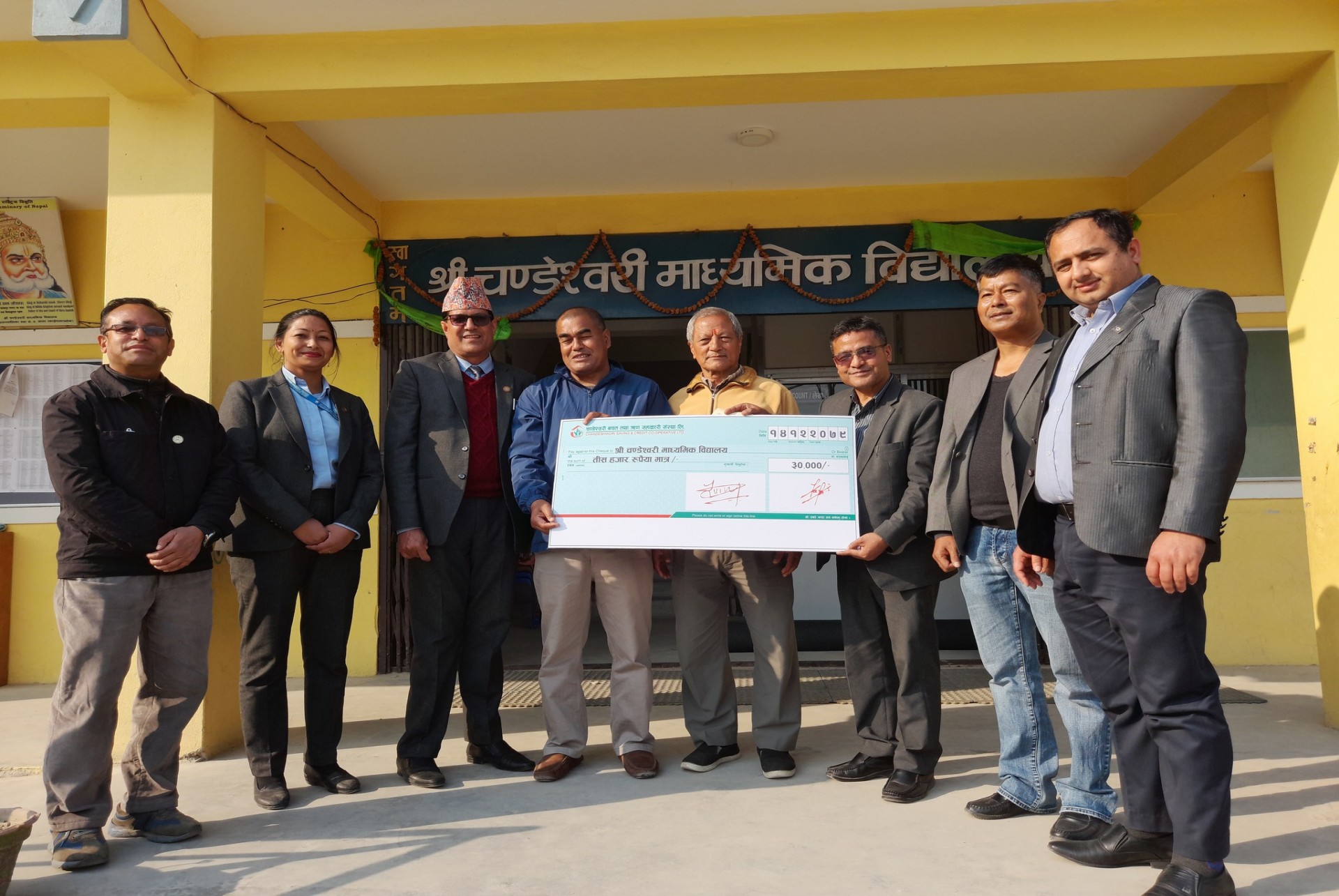 यस चण्डेश्वरी बचत तथा ऋण सहकारी संस्था को सामुदायीक बिकास कार्य योजना अन्र्तगत आज बनेपा वडा नंं. ४, नाला स्थीत श्री चण्डेश्वरी माध्यामीक बिद्यालय लाई रु ३०,०००।– रकम बराबरको खानेपानी प्युरिफायर हस्तान्तरण गरिएको छ । आज बिद्यालयमा भएको सानो कार्यक्रम मार्फत सो रकम संस्थाका अध्यक्ष नबिन भक्त बादे ज्यु मार्फत बिद्यालयका अध्यक्ष श्री श्याम शुन्दर श्रेष्ठ ज्यु लाई हस्तान्तरण गरिएको हो ।