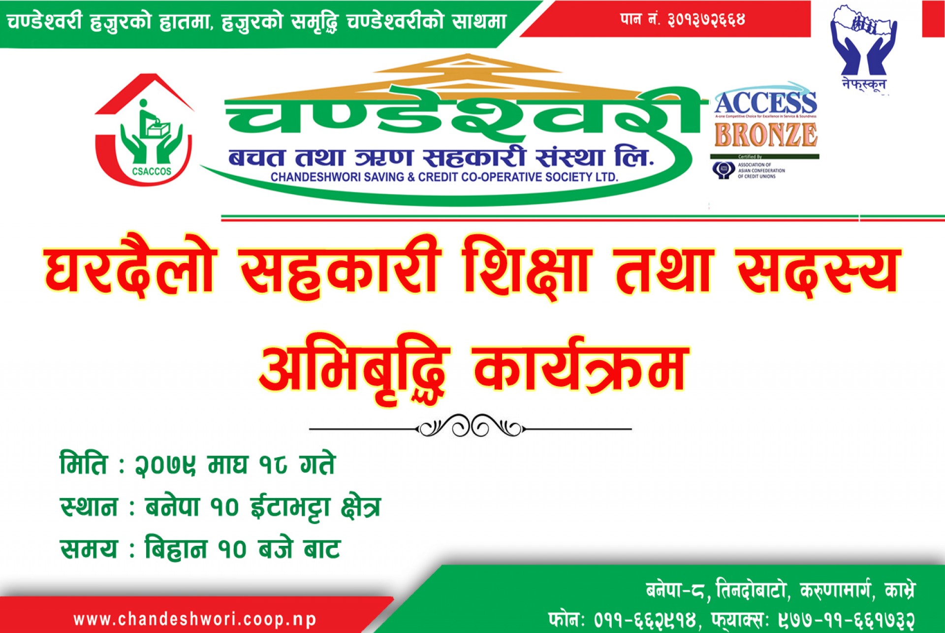 यस चण्डेश्वरी साकोसको घरदैलो सहकारी शिक्षा तथा सदस्यता बृद्धि कार्यक्रम मिति २०७९ माघ २८ गते बनेपा १० शान्तिनगर, ईटाभट्टा क्षेत्रमा सम्पन्न भएको छ । सस्थाको महिला बिकास उप समितिको आयोजनामा सम्पन्न सो कार्यक्रममा बनेपा १० शान्तिनगर क्षेत्रको स्थानिय बासिन्दा लाई सहकारी सम्बन्धि शिक्षा प्रदान गरिएको थियो । कार्यक्रममा १३ जना...