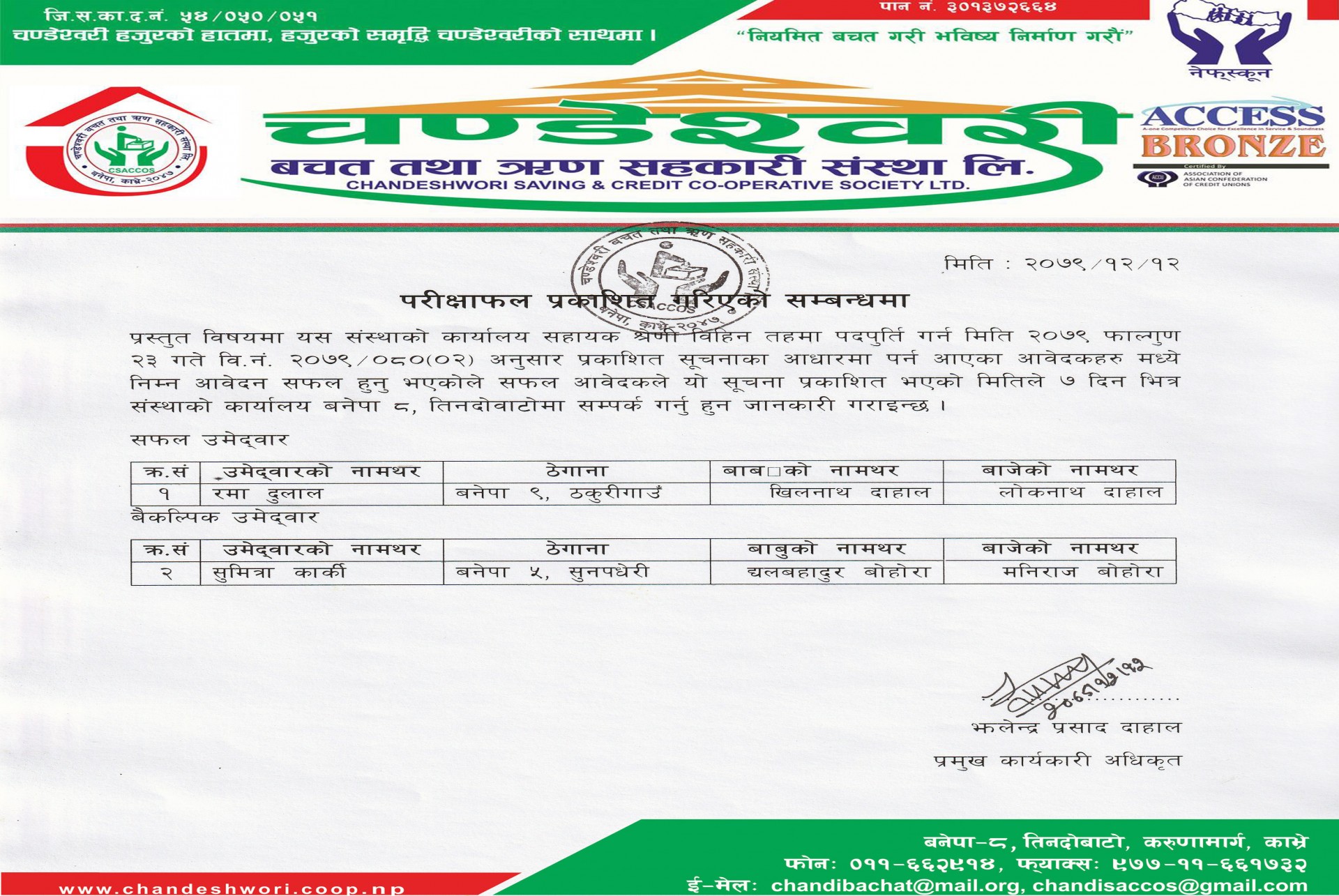 नतिजा प्रकाशित सम्बन्धि सुचना