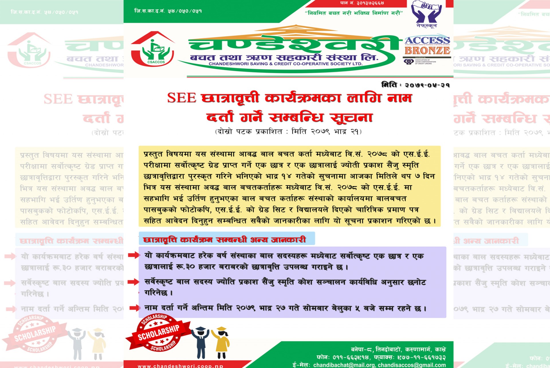 ज्योति प्रकाश सैँजु स्मृति छात्राबृती ( SEE) का लागी नाम दर्ता गर्ने सम्बन्धि सुचना ।।। यस संस्थामा आबद्ध बाल बचतकर्ता मध्यबाट २०७८ सालमा SEE परिक्षा दिई उत्तिर्ण हुनुभएको बाल बालीकाहरुलाई यो सुचना प्रकाशित मितिले ७ दिन भित्र २०७९ भाद्र २७ गते कार्यालय समय भित्र संस्थामा नाम दर्ता गर्नुहुनका लागी यो सुचना दोस्रो पटक प्रकाशित गरिएको छ ।