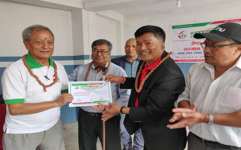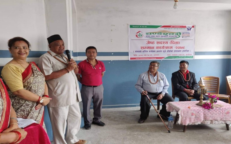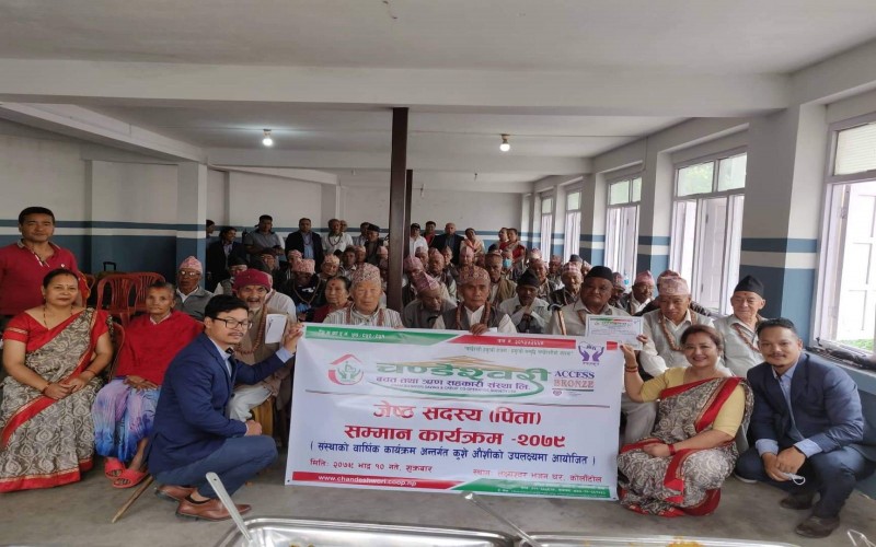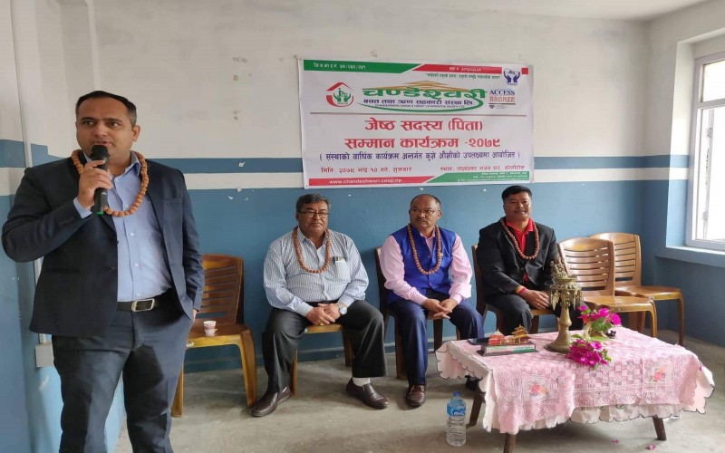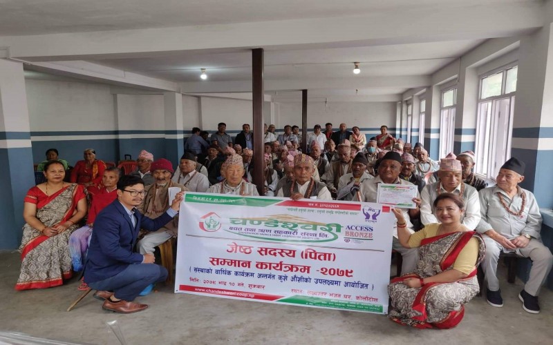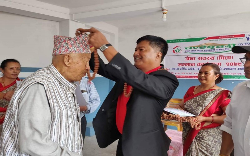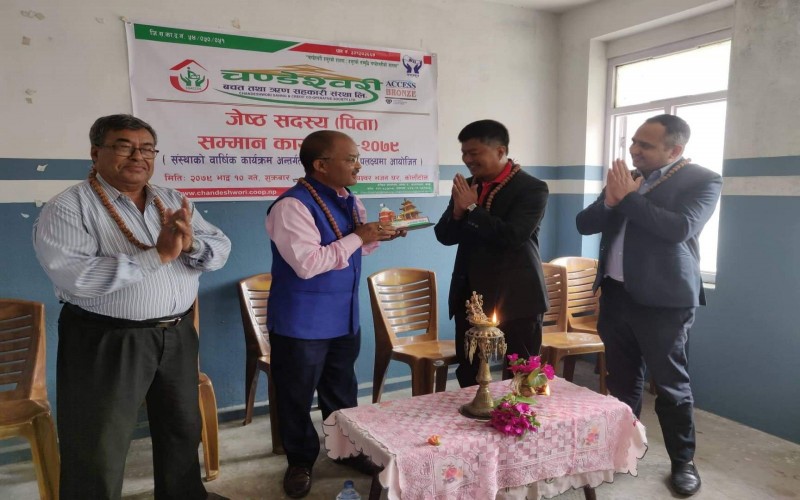 चण्डेश्वरी जेष्ठ सदस्य (पिता) सम्मान कार्यक्रम सम्पन्न ः यस चण्डेश्वरी बचत तथा ऋण सहकारी संस्था लि. को बार्षिक कार्यक्रम अन्र्तगत यस संस्थाका अध्यक्ष श्री बिकास बादे ज्यु को अध्यक्ष्यतामा कुशे औशि को अवसरमा आज २०७९ भाद्र १० गते, ७५ बर्ष नाघेका जेष्ठ पुरुष सदस्य सम्मान कार्यक्रम सम्पन्न भएको छ । बनेपा नगरपालिकाका प्रमुख श्री शान्ति रत्न शाक्य ज्यूको प्रमुख अतिथ्यतामा बनेपा वडा नं. ८, कोलाँटोल स्थीत लक्ष्यश्वर भजन घरमा सो कार्यक्रम सम्पन्न गरिएको थियो ।