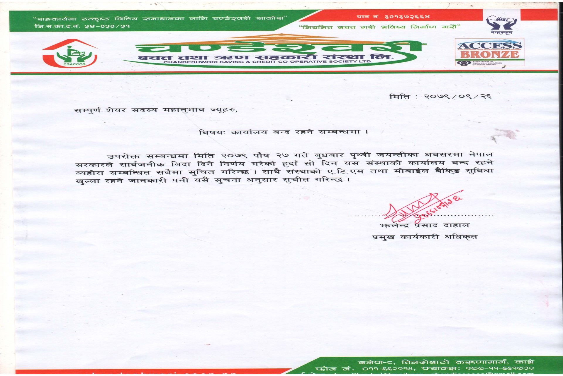 कार्यालय बन्द रहने सम्बन्धि सुचना ।।।