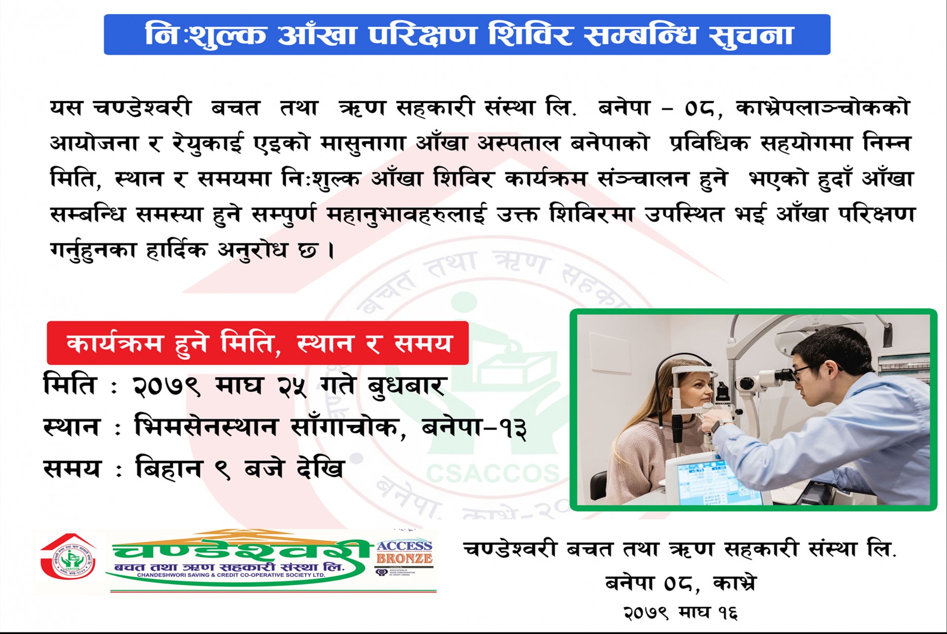 निःशुल्क आँखा शिविर संचालन हुने सम्बन्धी सूचना
