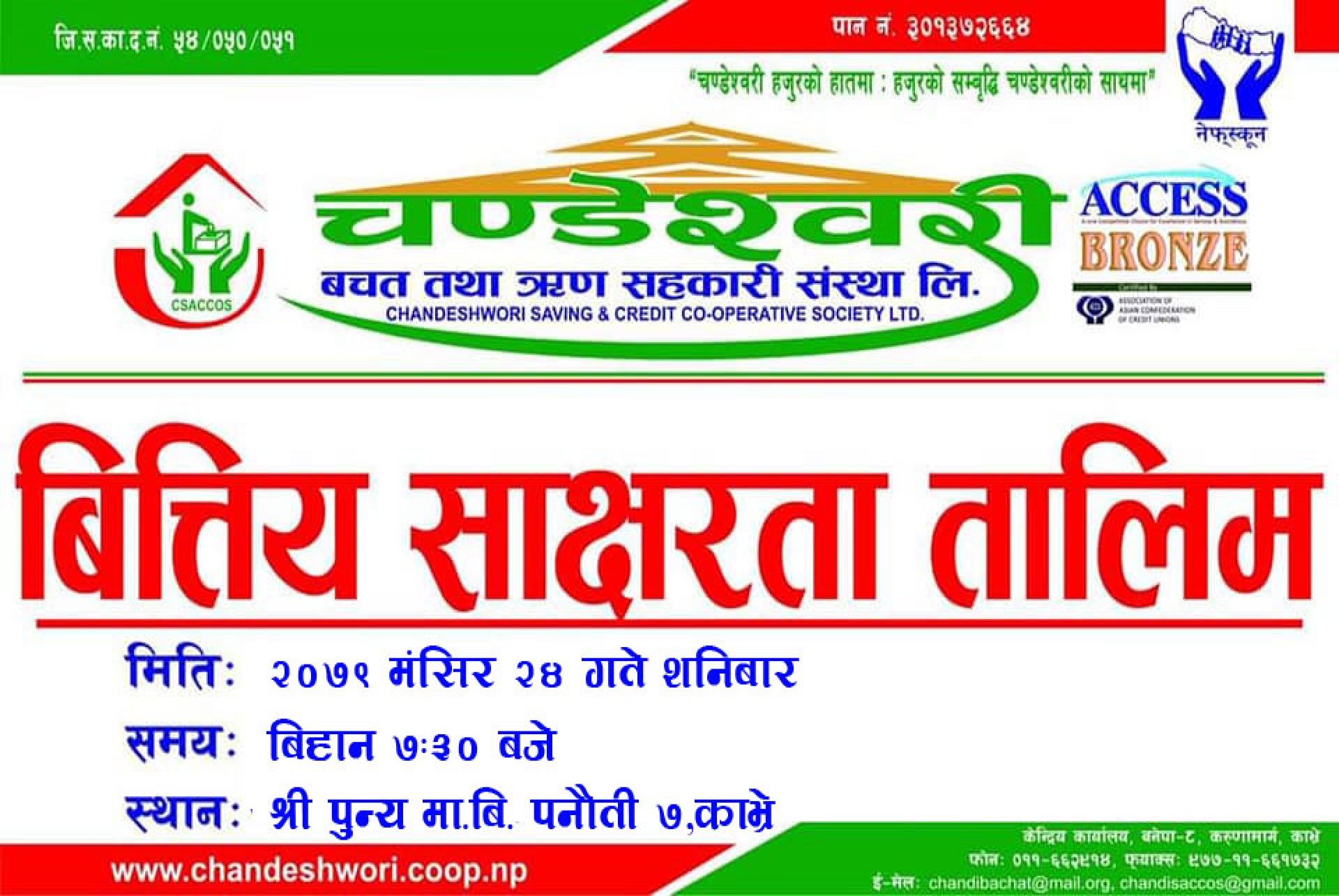 यस चण्डेश्वरी बचत तथा ऋण सहकारी संस्था लि. को शेयर सदस्य ज्युहरु तथा समुदायलाई सहकारी सम्बन्धि ज्ञान दिन तथा बित्तिय साक्षरता मार्फत सदस्यहरुको आर्थिक शसक्तिकरण गर्न निम्न मिति समय र स्थानमा बित्तिय साक्षरता तालिम कार्यक्रम संचालन हुन गईरहेको हुदाँ सम्पुर्ण सदस्यहरुलाई कार्यक्रममा उपस्थित भई लाभान्वीत हुनका लागि हार्दिक अनुरोध गरिन्छ । मिति ः २०७९ मंसीर २४ गते शनिबार समय ः बिहान ७ः३० बजे स्थान ः श्री पुण्य माध्यमिक बिद्यालय, पनौती ७, इन्दे्रश्वर मण्डीर अगाडि