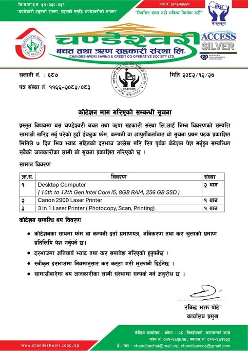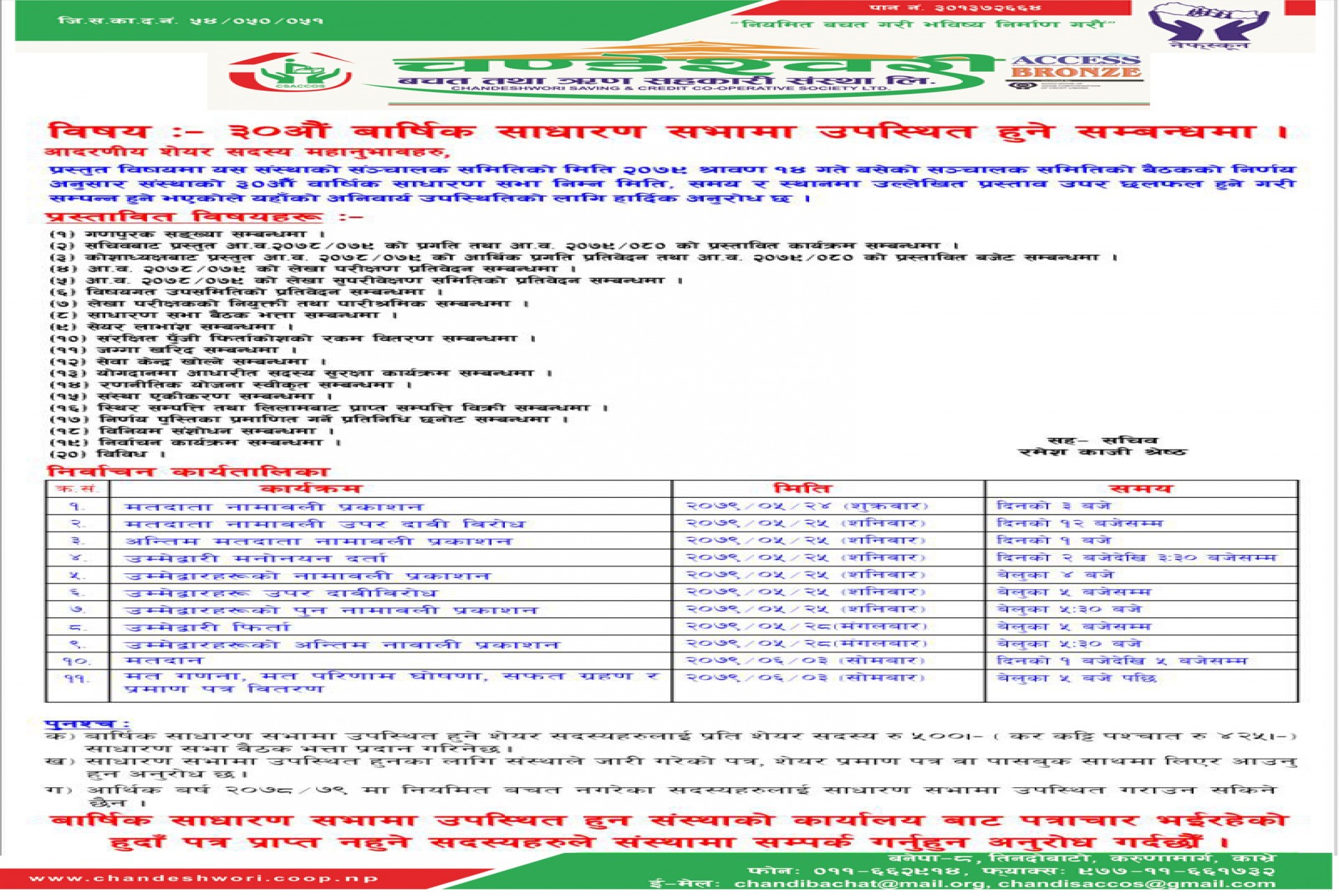 ३० औँ बार्षिक साधारण सभा सम्बन्धि सुचना ।। यस संस्थाको ३० आँै बार्षिक साधारण सभा यहि मिति २०७९ असोज ३ गते बनेपामा रहेको बनेपा पर्टि भेन्यु मा सम्पन्न हुन गई रहेको व्यहोरा सम्पुर्ण शेयर सदस्य महानुभावहरुमा सुचित गरिन्छ । साथै भाद्र २४ गते बाट निर्बाचन कार्यक्रम सुरु हुन गईरहेको व्यहोरा पनि अवगत गराउन चाहन्छु ।